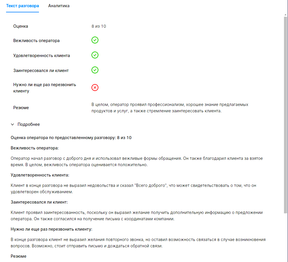 Например, вот как сейчас мы можем оценить разговор сотрудника нашей компании с потенциальным нашим клиентом: